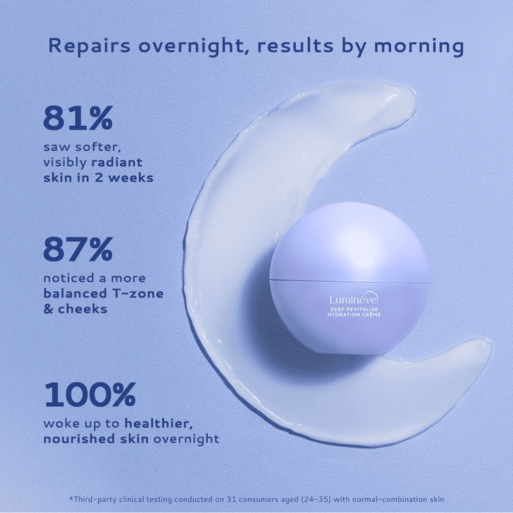 Luminéve’s Deep Revitalise Hydration Crème hydrates and balances normal to combination skin overnight. Its encapsulation technology locks in lasting moisture while working with the skin’s natural rhythm, leaving it fresh, dewy and visibly revitalised.