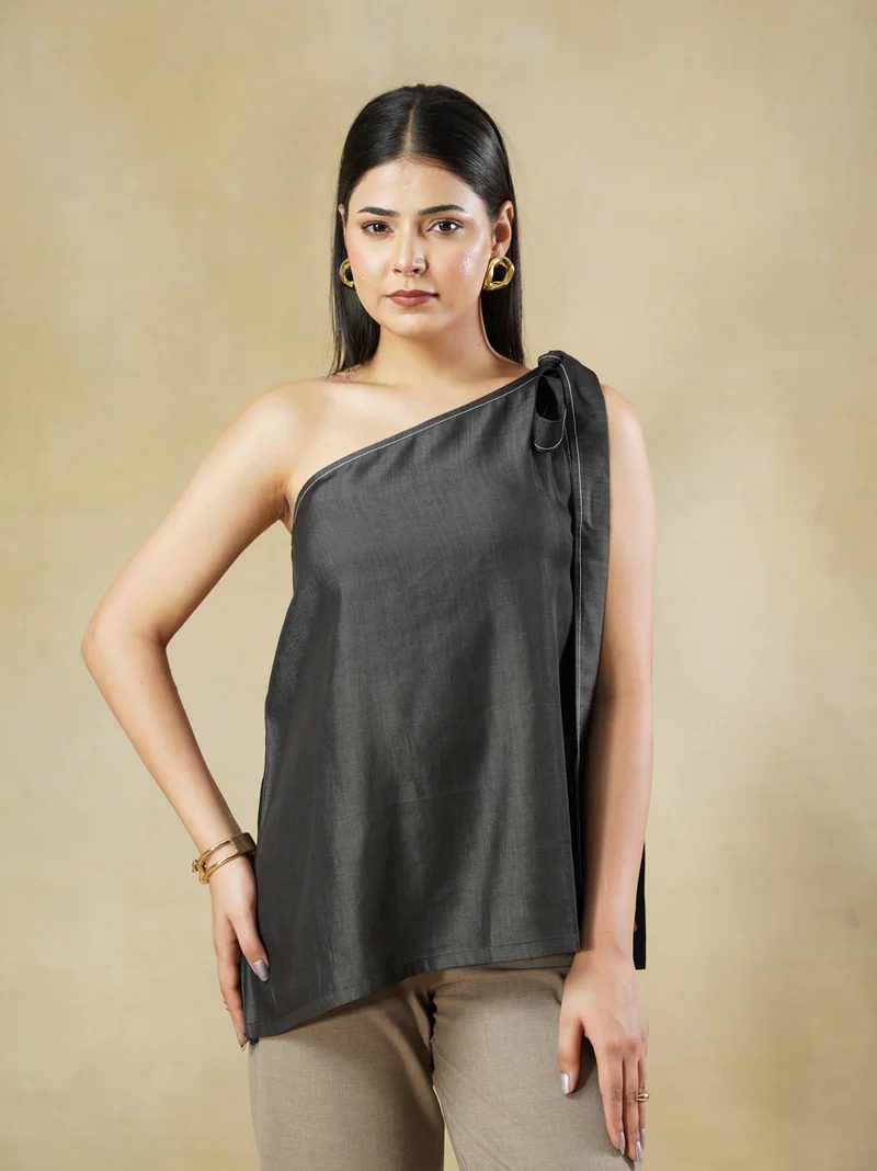 SAKU’s Madeline top channels modern minimalism with a sleek one-shoulder silhouette and sharp contrast stitching that adds just the right edge. The adjustable tie-up waist flatters the fit while keeping the look effortless and refined, making it a statement black top that feels equal parts chic and contemporary.