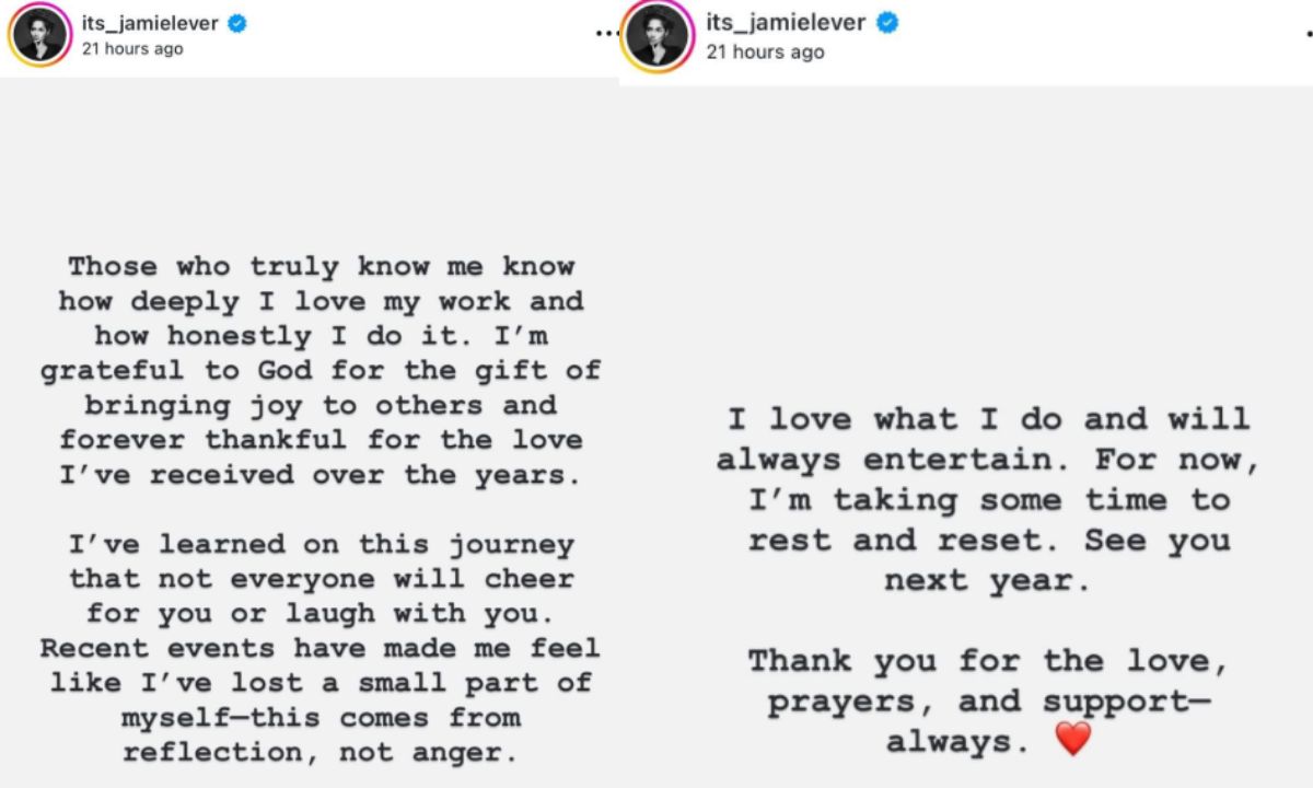 Jamie Lever further conveyed her decision of staying away from social media, and taking some time off. She assured her fans that she would be back next year and also thanked them for the love and support. However, this post is not visible on her handle now. It was assumed that this decision was made after Jamie Lever received backlash for her reel on Bigg Boss 19 contestant Tanya Mittal. However, she has has now given an official statement to put an end to such rumours.