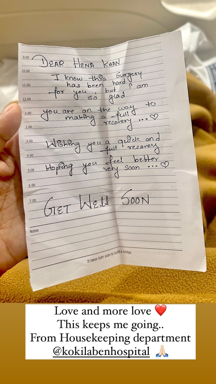 In one of the pictures, Hina is seen lying on the hospital bed, giving a partial view of herself next to the window. She captioned the image, requesting prayers from her followers. Hina candidly expressed the continuous pain she is enduring. She emphasized that even when she smiles or doesn’t mention it, she is still in pain. Her note poignantly highlighted the constant struggle she faces, despite putting on a brave face. Hina also shared a heartfelt note from the hospital staff, which wished her a speedy and full recovery. The message acknowledged the difficulty of the surgery and expressed joy at her progress. The note, filled with warm wishes, was a source of encouragement for Hina. She expressed her gratitude, mentioning that such gestures keep her motivated during these challenging times.