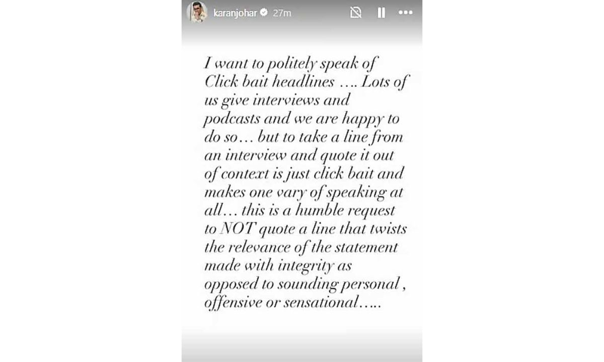 Karan Johar took to his Instagram and shared a story in which he wrote that he wanted to politely speak about clickbait headlines. He penned that lots of them give interviews and podcasts, and they are happy to do so but to take a line from an interview and quote it out of context is just clickbait and makes one vary of speaking at all. He further humbly requested not to quote a line that twists the relevance of the statement made with integrity as opposed to sounding personal, offensive, or sensational. Check it out below!