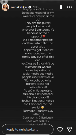On Monday, January 19, Neha Kakkar took to her Instagram stories to discuss stepping away from various aspects of her life, including responsibilities. She also asked the media not to photograph her. But she was also quick to delete this post, but it had already become widespread with people speculating trouble in her personal life, and even a chance of divorce. But later in the day, Neha again took to her Instagram and urged not to bring her husband Rohanpreet Singh or her family into this.