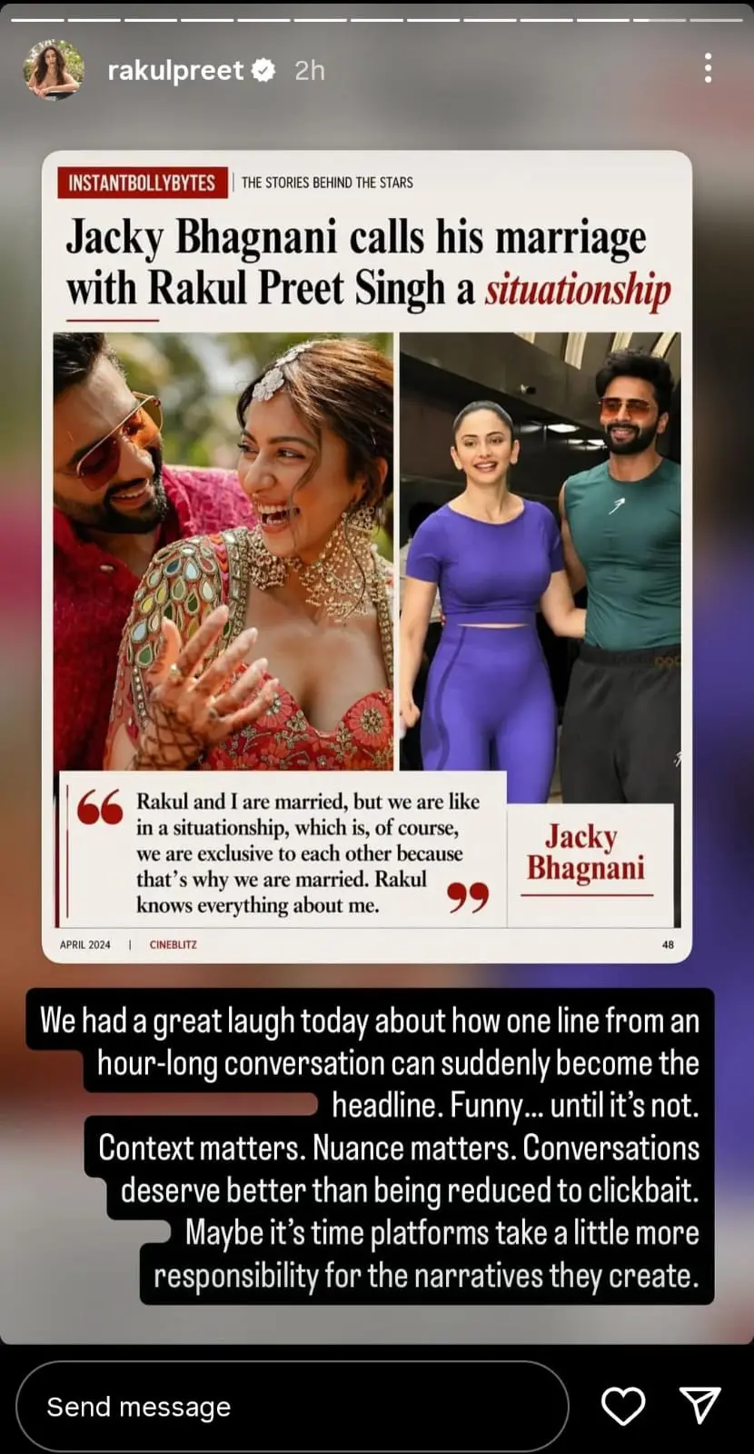 On Friday, April 24, Rakul Preet Singh took to her Instagram stories and shared a note stating that her husband’s remark was taken out of context. She wrote, “We had a great laugh today about how one line from an hour-long conversation can suddenly become the headline. Funny… until it’s not. Context matters. Nuance matters. Conversations deserve better than being reduced to clickbait. Maybe it’s time platforms take a little more responsibility for the narratives they create.”