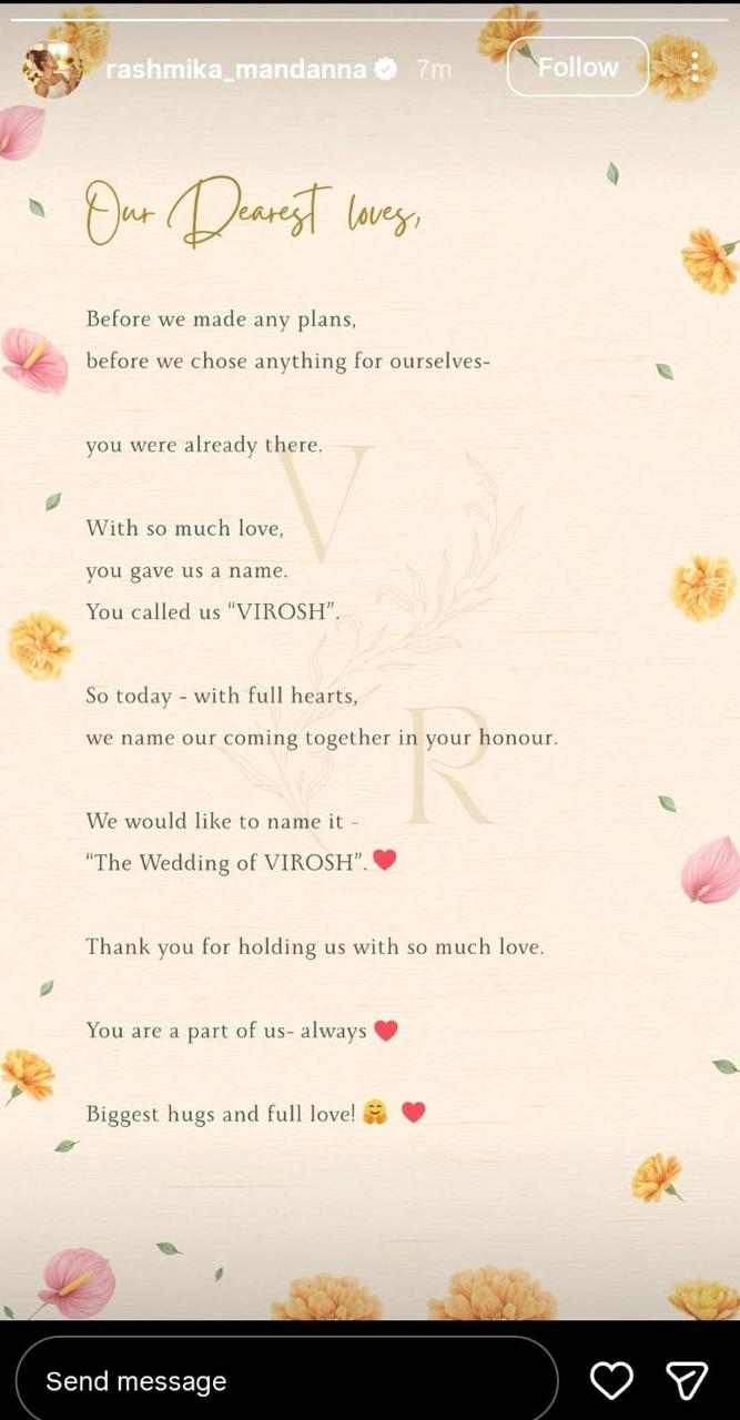 Vijay and Rashmika shared a personal note on their Instagram stories, confirming their upcoming wedding. They wrote, “Our Dearest loves, Before we made any plans, before we chose anything for ourselves—you were already there. With so much love, you gave us a name. You called us ‘VIROSH.’”