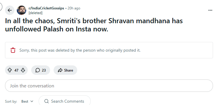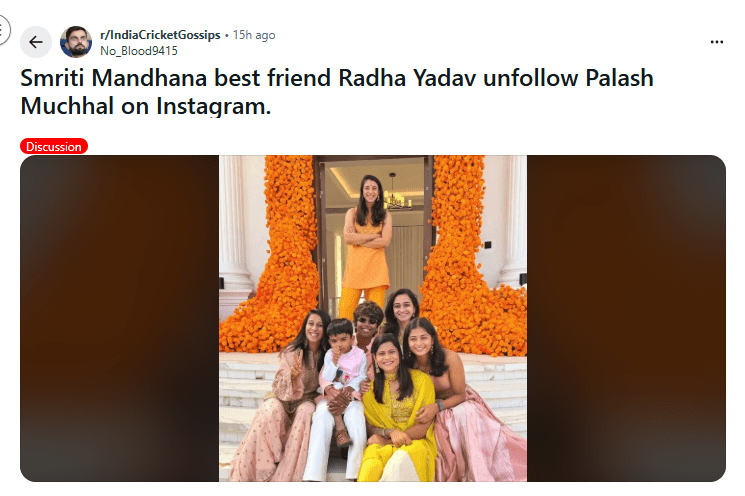 Amid all the cheating chaos around Smriti Mandhana and Palash Muchhal, a Reddit user shared something unexpected. They wrote, In all the chaos, Shravan Mandhana has unfollowed Palash on Instagram now.” This shocked everyone, leading to people commenting that this was the ‘final nail’ in the coffin. Another thread claimed that the cricketer’s best friend, Radha Yadav, also unfollowed the composer on Instagram, along with cricketer Radhika Thakur. Internet users commented, “Why did that manchild have to do this. Lots of love and strength to Smriti.” Check out the claims below!