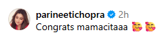Newest mama in town, Parineeti Chopra wrote, “Congrats mamacitaaa.” But what caught our eyes was Kapoor’s husband, Anand Ahuja, hyping her up in the comment sections with two beautiful comments. He wrote, “double trouble” with heart eye emoticons and “Baby ma.. also chicccccc mama!” The actress’s mother, Sunita Kapoor, also complimented her look.