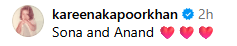 Kareena Kapoor Khan dropped into her Veere’s comment section and wrote, “Sona and Anand” with three heart emojis. Desi girl Priyanka Chopra wrote, “Congratulations” with a heart, fire, and hand emoji. Sonam’s cutest sisters, Khushi Kapoor and Shanaya Kapoor, dropped heart eye emojis to congratulate their cousin sister. Alia Bhatt’s sister, Shaheen Bhatt, also congratulated the mother-to-be.