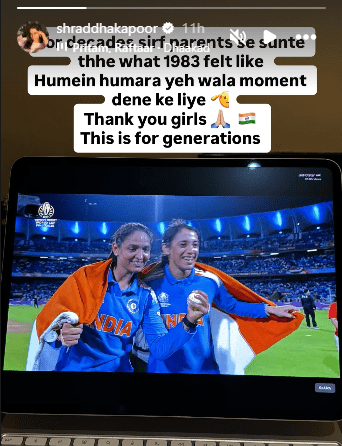 Shraddha Kapoor compared the victory to India’s historic 1983 triumph. She wrote, We used to hear the stories about the emotion our parents felt after India won the World Cup in 1983. Thank you for giving us that moment.”