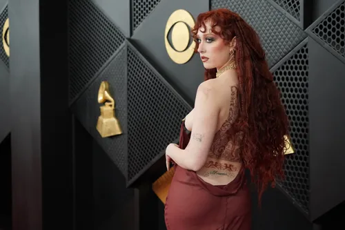 Chappell Roan’s naked dress stole the show with a burgundy sheer fabric hanging from a faux n*pple ring. The gown transformed into a train further down and was complemented by unique body art that also had a large lace tattoo on her back and a pony-inspired design on her chest, a playful nod to her famous ‘Pink Pony Club’ era.