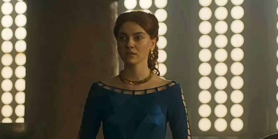 In episode 2, ‘The Rogue Prince,’ viewers were visibly delighted to see Alicent Hightower played by Emily Carey’s sartorial choice. In the 53 minutes long episode, we see Alicent in a deep blue gown, featuring a multi-loop neckline, that runs down to the sleeves. Accentuating the regal shade, the textured fabric aids Alicent’s visible transformation from episodes one to two. Keeping her pale-adored colour palette aside, Alicent dives into a deeper and more royal shade to take the narrative forward. While her gown does the duties of stealing the scene, what caught the internet’s attention was her magnificent, brass neckpiece.