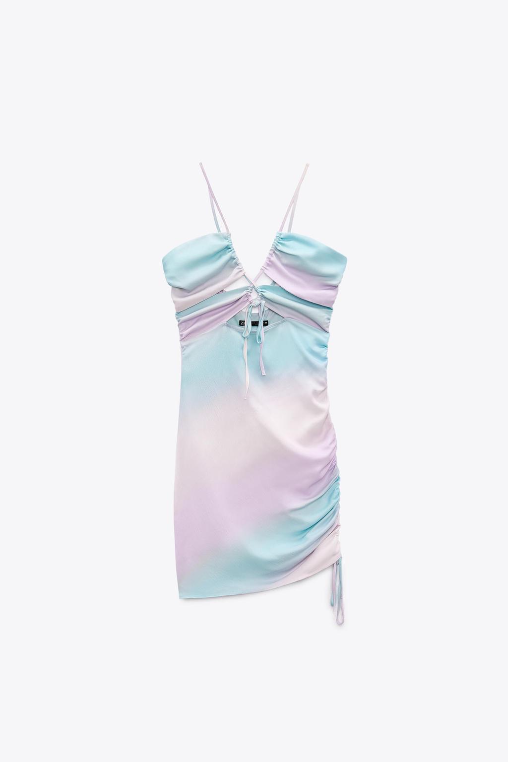 Another of our preferred picks from Zara is this mermaid-hued, cut-out dress. Featuring thin, cross-back straps, adjustable gathered detail on the side and drawstrings, this satin, mini tie-dye dress is both chic and easy on your pocket. Shop Here