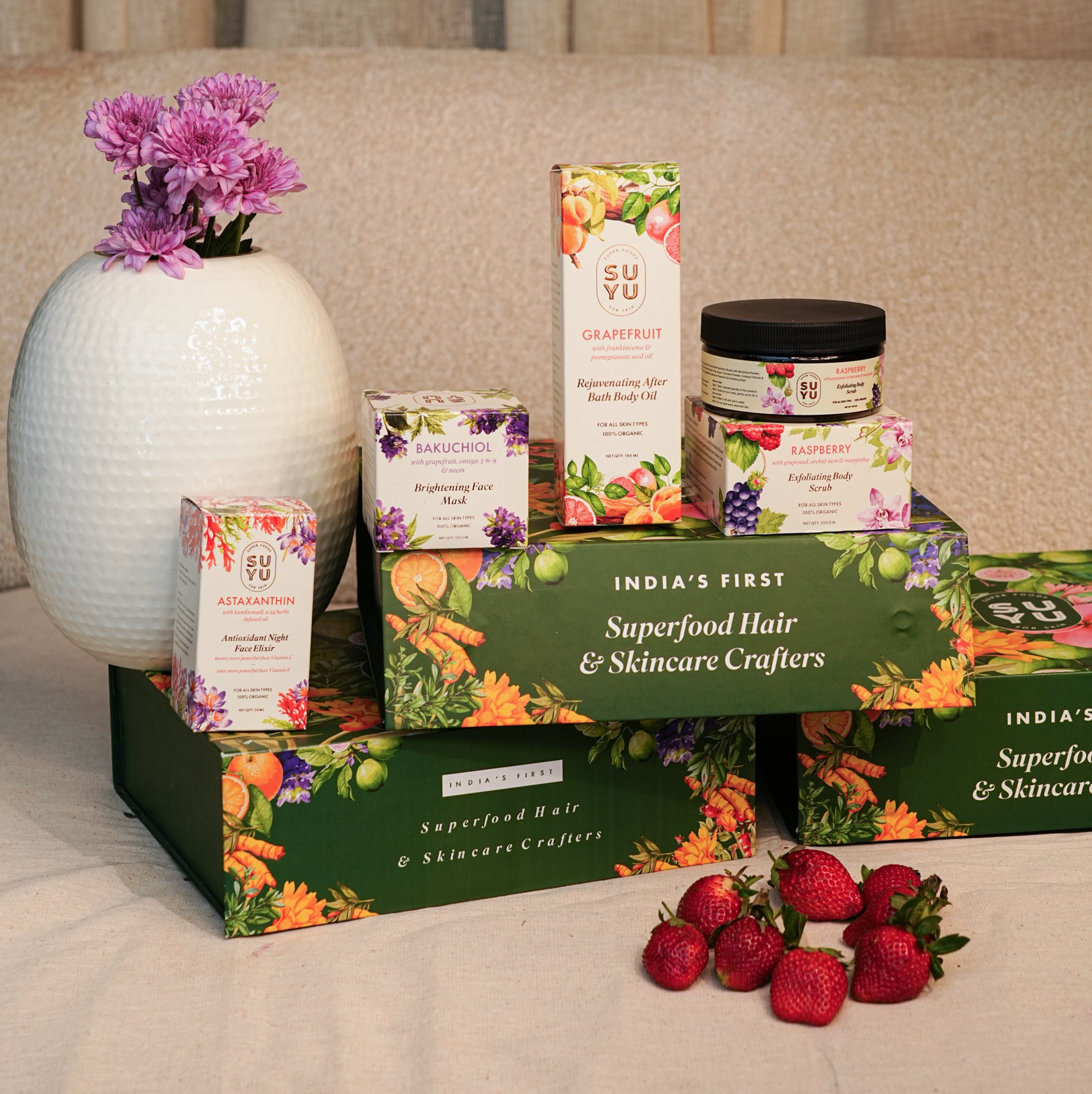 The Suyu Shine All Over Gift Box is a spa day in a box. With a raspberry body scrub that buffs away dullness, a grapefruit oil that hydrates without greasiness, and a bakuchiol mask that firms while you sleep, this kit covers every skincare need. It even includes an antioxidant night elixir for that extra touch of luxury.