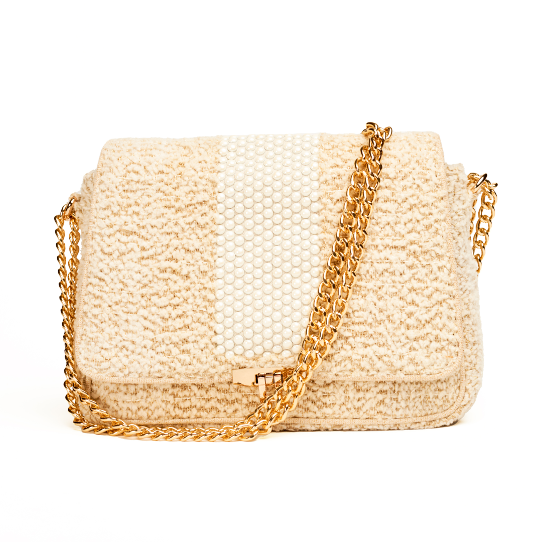 White Pearl Shoulder Bag by Etcetera – The Etcetera Pearl Shoulder Bag is a handcrafted beauty made from creamy cotton looped thread fabric, adorned with delicate pearls. With a gold-finish lock and chain handle, it’s both functional and stylish.