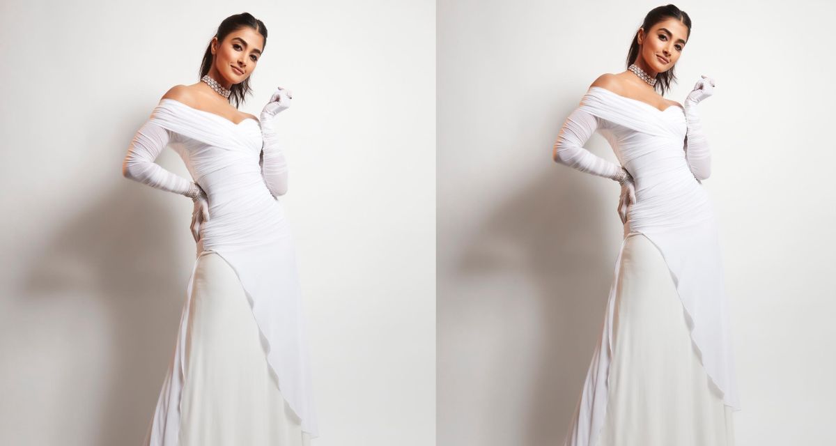 Pooja Hegde looks stunning in an immaculate white gown with a ribbed pattern on the upper half and a flowing lower half.
