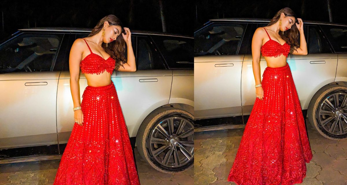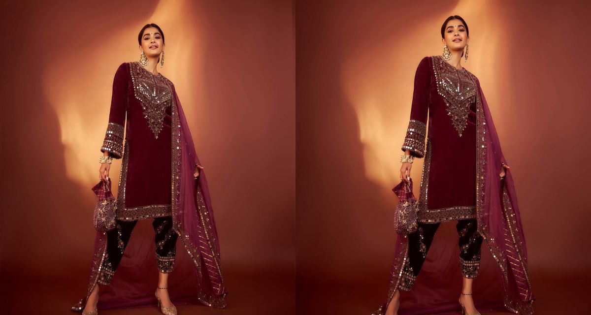 Pooja Hegde looks stunning in a maroon kurta and leggings with extensively intricate mirror work, which provides an excellent contrast to the colour.