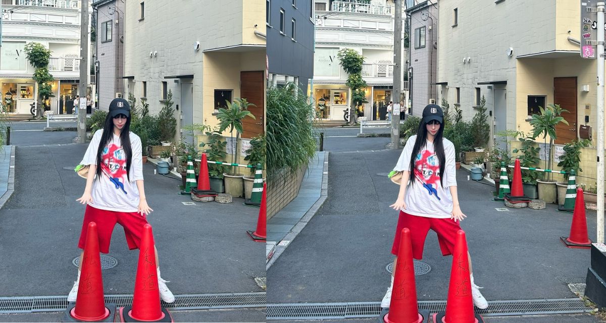 Karina proves she can pull off any outfit, even bright red shorts and an oversized shirt!