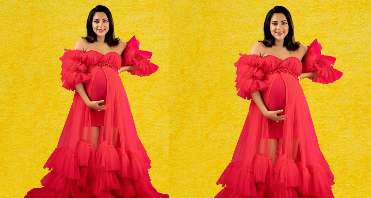 To add some oomph to her pregnancy looks, Amala amped it up with a neon dress featuring a ruffle neckline.