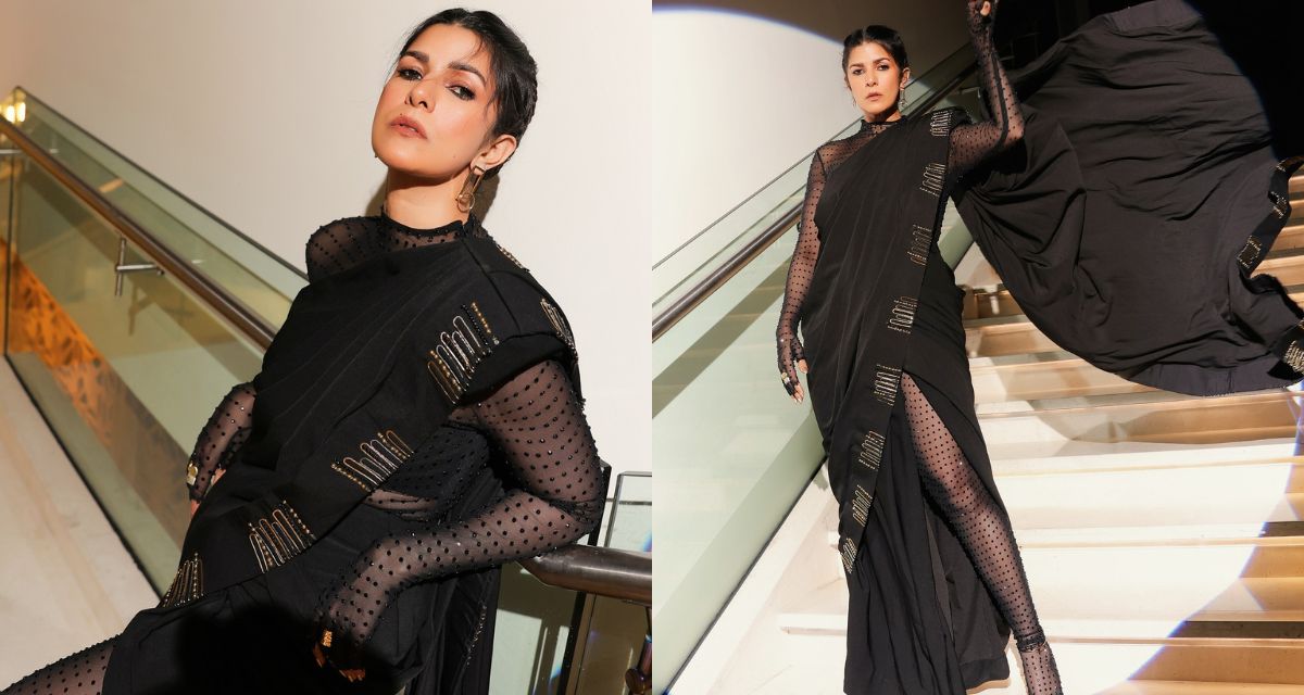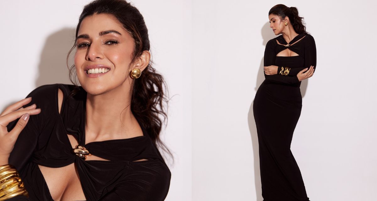 In a complete black asymmetrical gown with cutouts at the neck, Nimrat Kaur looked stunning.