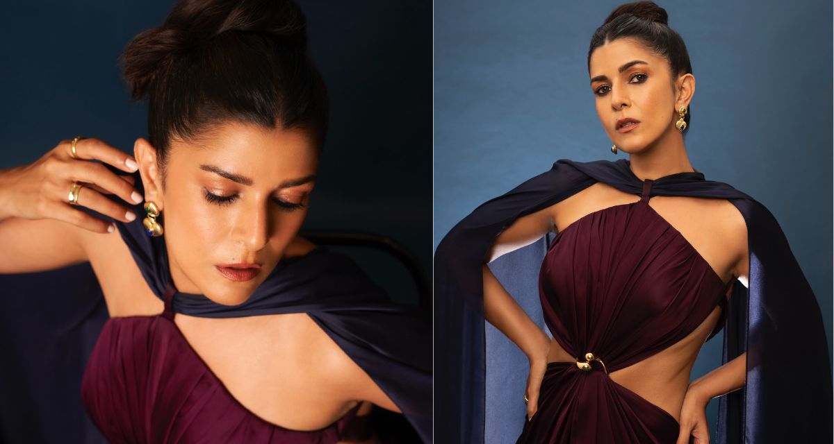 Nimrat Kaur stunned in a patterned burgundy gown featuring flowing cape sleeves and a thigh slit. Keeping it chic and classy, she styled her hair in a sleek bun and radiated a powerful aura by opting for smudged makeup.