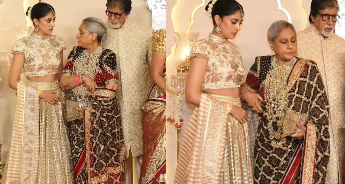 For the grand wedding of Anant Ambani and Radhika Merchant's wedding, Jaya Bachchan wore this bandhani red and green saree and paired it with a massive diamond neckpiece. The neck pieces take away everything and the saree kept falling from her shoulder. It's a total miss!