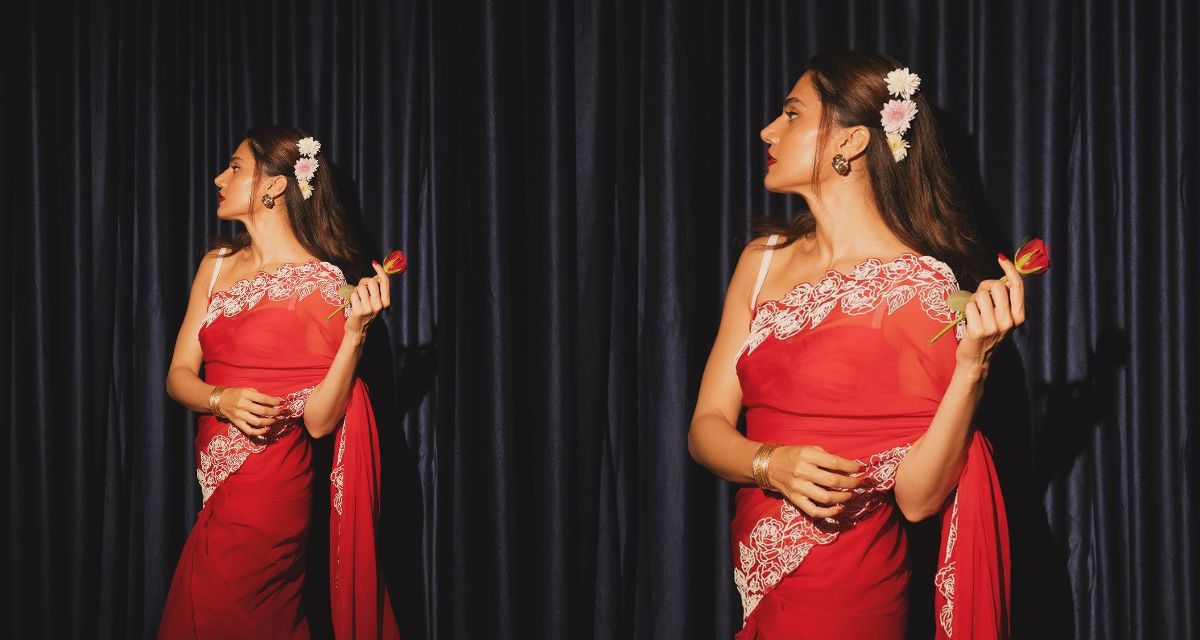 These multicoloured flowers give the perfect "modern touch" to the saree and you can too put small flowers on the side of your usual side-parted hairstyle to enhance it. Taapsee Pannu nailed it!