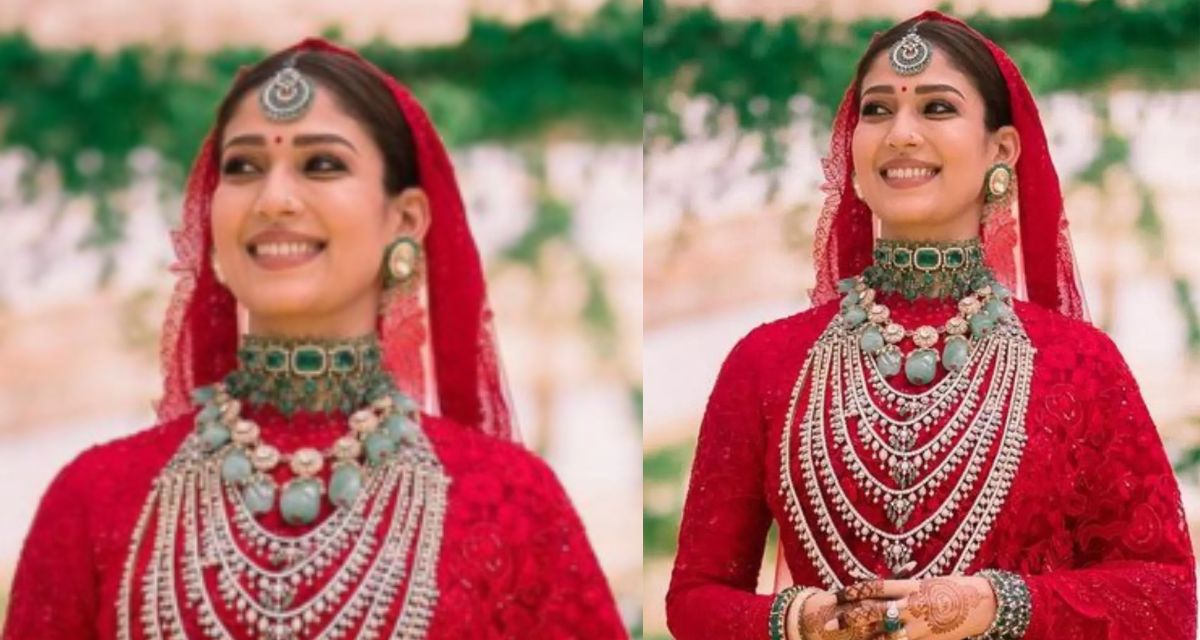 Nayanthara chose a bright saree for her big day. She styled it with heavy diamond jewellery and we love this.