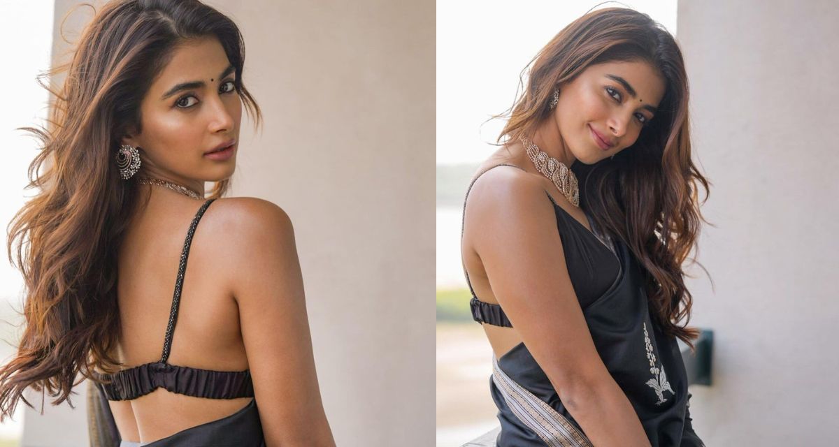 She knows how to amp up her style! Pooja Hegde serves hotness in this stunning black saree paired with a bralette blouse.