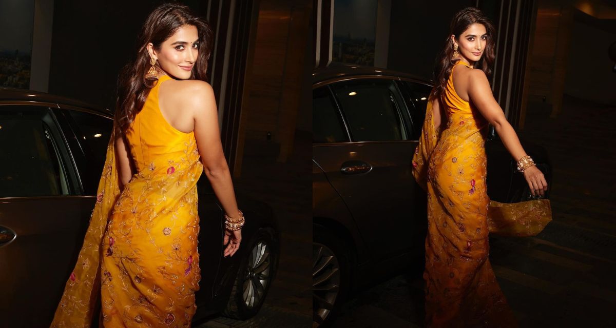 Pooja Hegde donned a beautiful yellow floral saree. The intricate details of the pink flowers look so pretty!