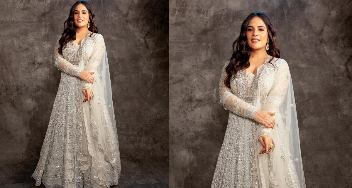 Richa doesn’t forget to bring a little shimmer and sparkle with this white embroidered anarkali look.