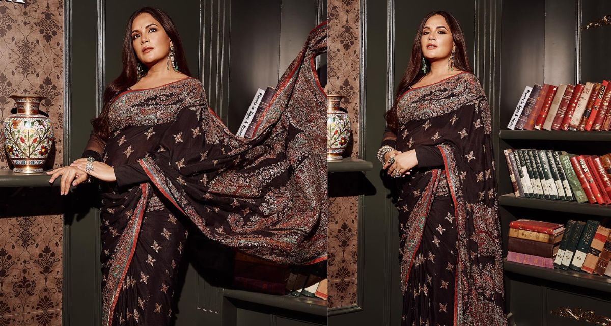 During Heeramandi promotions, Richa Chadha stole the show in a black printed saree, draped so gracefully.