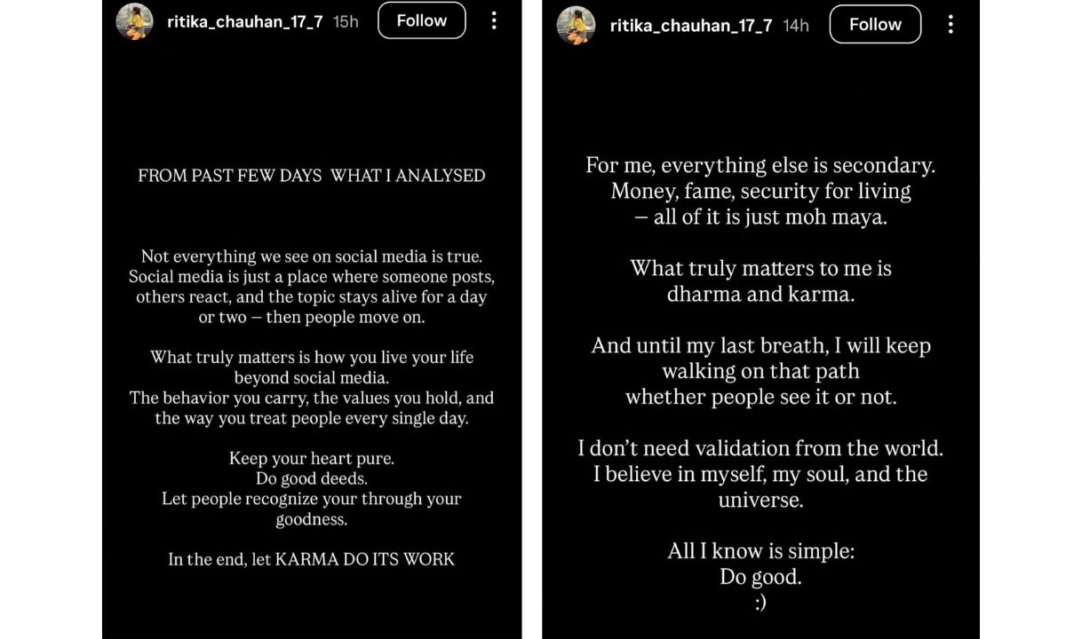 In the next story, she reportedly shared that for her, everything else is secondary. Money, fame, security for living, and that all of that is just “moh maya.” For Ritika, what actually matters is dharma and karma. Until her last breath, she will keep walking on that path, whether people see it or not. Ritika expressed not needing validation from the world and that she believes in herself, her soul, and the universe. All she knows is simple: “Do good.”
