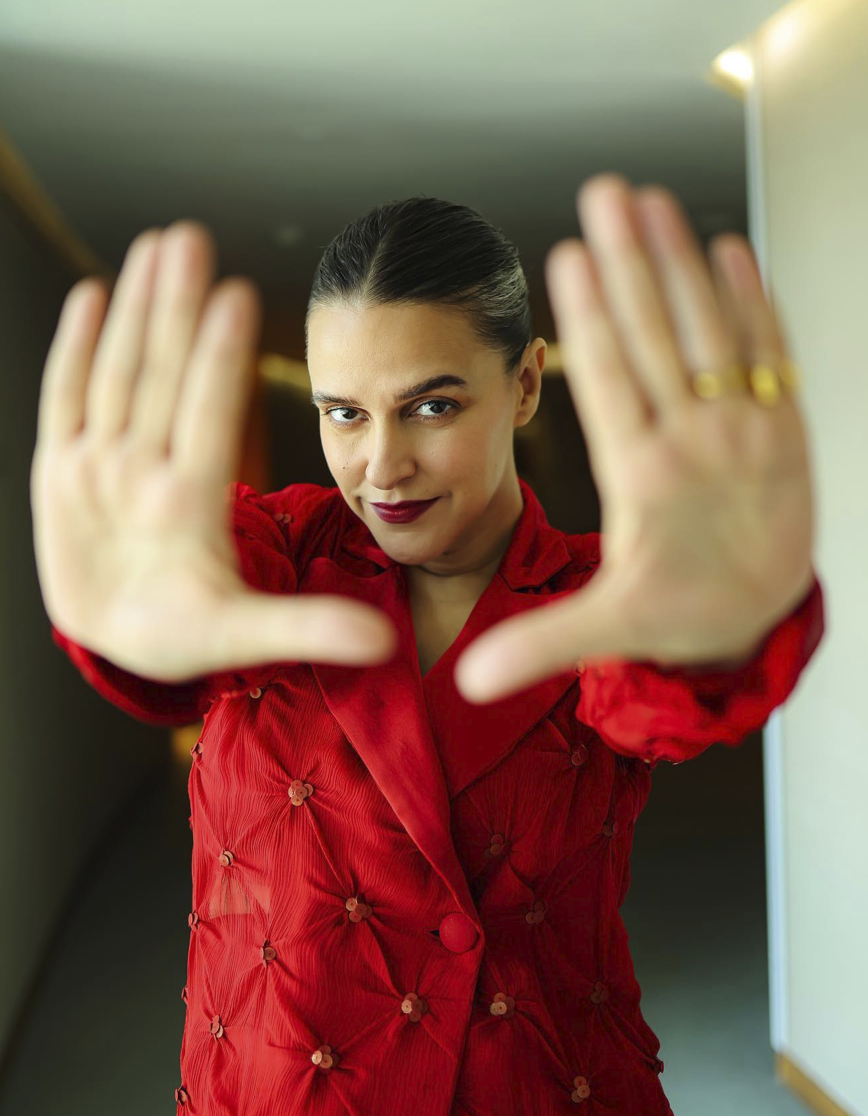 Her latest look features a bold Anamika Khanna blazer and drape skirt with unique sequin detail.