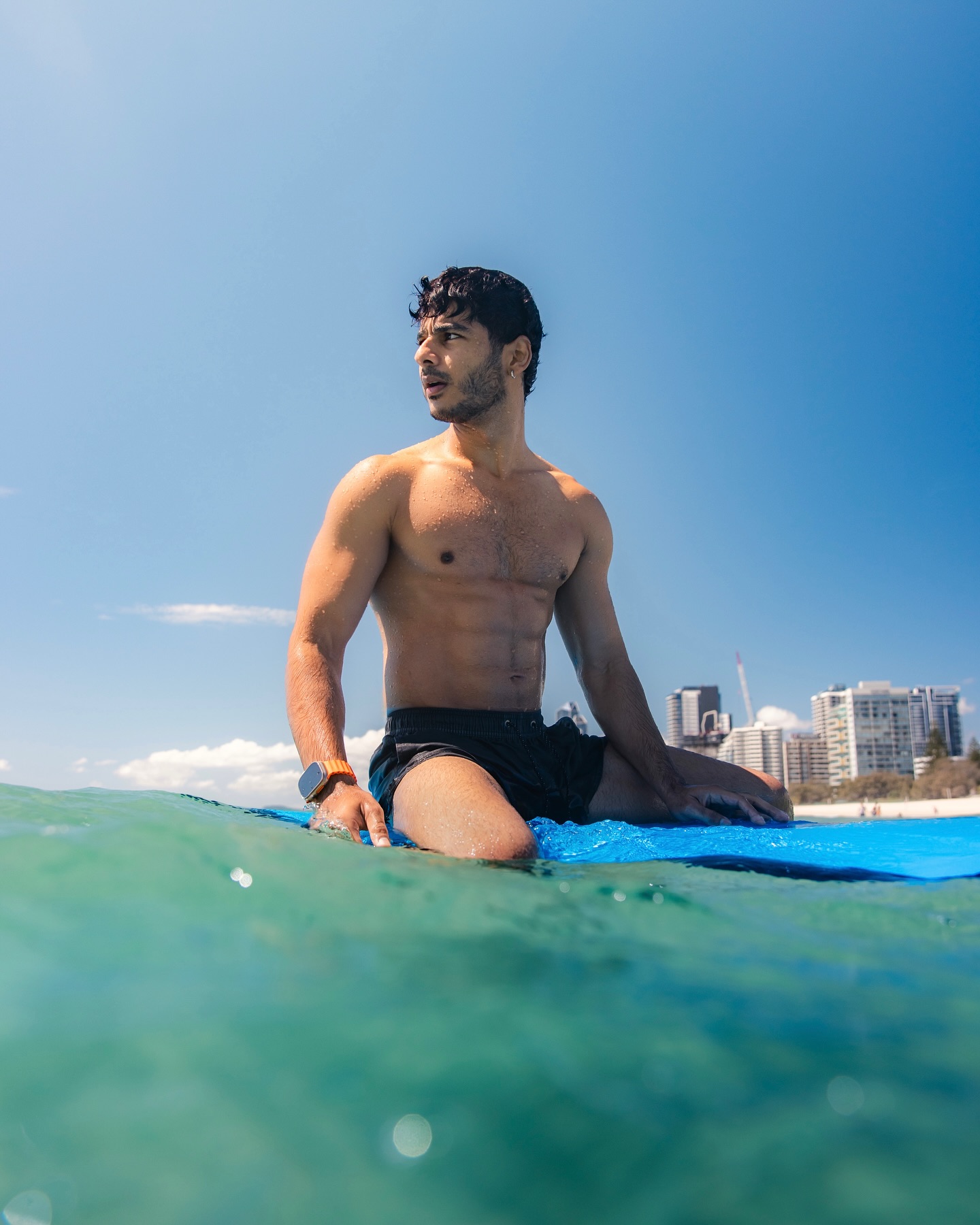 Ishaan rocked just shorts while surfing in Australia’s Gold Coast.